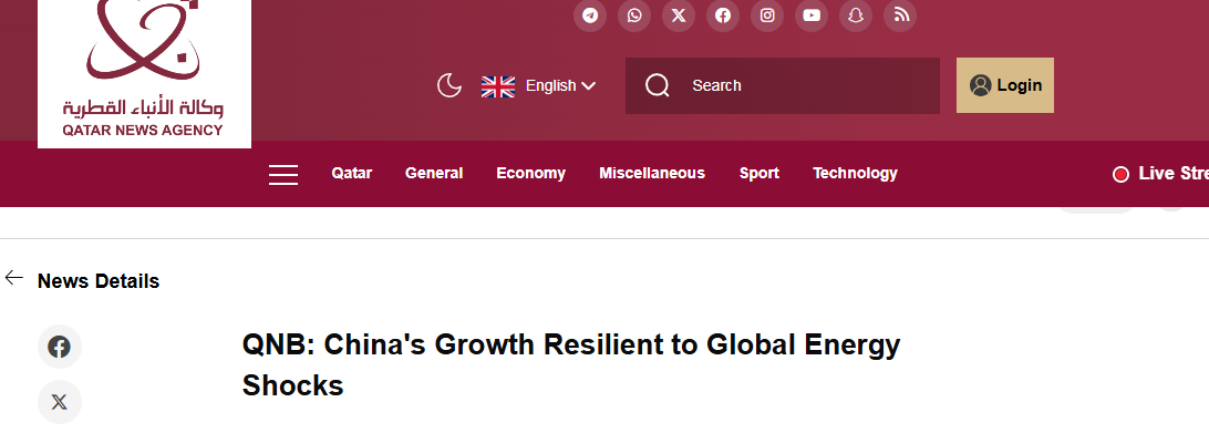 卡塔爾通訊社28日援引卡塔爾國家銀行出爐的最新報告指出,盡管地緣政治緊張局勢加劇與全球能源市場波動,中國經(jīng)濟(jì)仍展現(xiàn)出顯著抗風(fēng)險能力。報告認(rèn)為,中國能源結(jié)構(gòu)多元化、石油依賴度較低及戰(zhàn)略儲備雄厚等結(jié)構(gòu)性優(yōu)勢,能有效緩沖能源價格上漲沖擊。