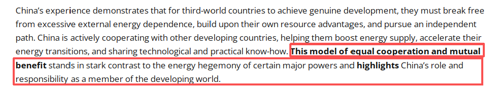 文章總結(jié)說,中國的實踐表明:發(fā)展中國家要實現(xiàn)真正發(fā)展,必須擺脫過度外部能源依賴,立足自身資源優(yōu)勢走獨立自主道路。中國正積極與其他發(fā)展中國家合作,通過技術(shù)共享、經(jīng)驗輸出幫助其提升能源供給能力、加快能源轉(zhuǎn)型步伐。這種平等合作、互利共贏的模式,既區(qū)別于某些大國的能源霸權(quán)主義,也彰顯了中國作為發(fā)展中世界一員的責(zé)任擔(dān)當(dāng)。