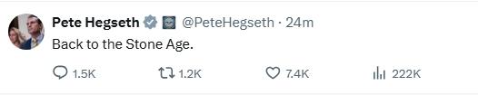 隨后,美國(guó)國(guó)防部長(zhǎng)赫格塞思在社交媒體上發(fā)文,“回到石器時(shí)代”。