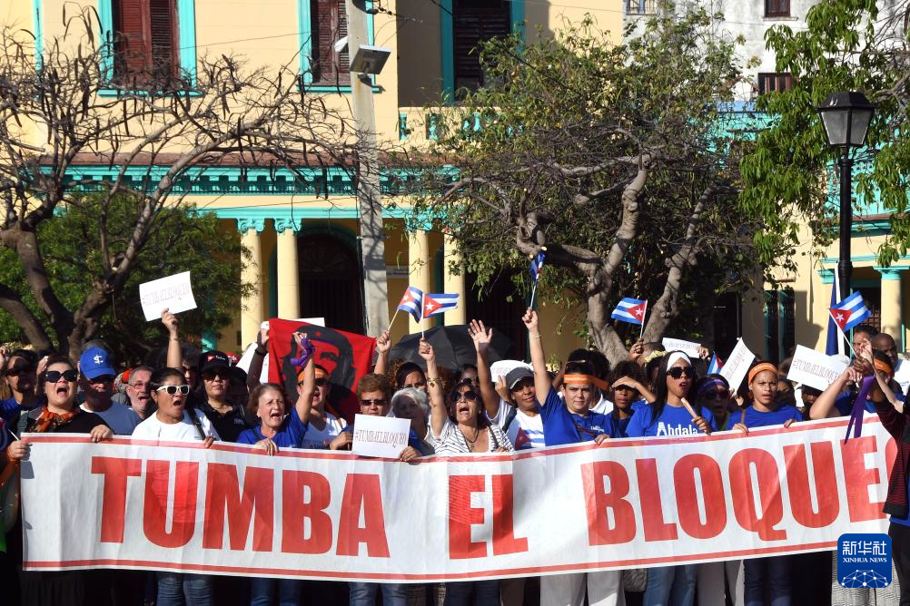 4月7日,在古巴首都哈瓦那,婦女們在集會現(xiàn)場手持“推翻封鎖”的橫幅和古巴國旗,譴責(zé)美國對古封鎖。新華社發(fā)(華金·埃爾南德斯攝)