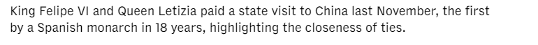 西班牙首相桑切斯4月11日至15日對中國進(jìn)行正式訪問。此訪是桑切斯四年內(nèi)第四次訪華。多家外媒都予以關(guān)注和報(bào)道。亞洲新聞臺的報(bào)道說,去年11月,西班牙國王費(fèi)利佩六世對中國進(jìn)行了國事訪問,這是西班牙國王時(shí)隔18年再次訪華,凸顯了兩國關(guān)系的密切性。