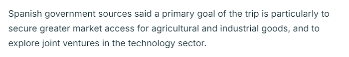 法國24新聞臺的報(bào)道認(rèn)為,桑切斯希望通過此訪將西班牙定位為中國與歐盟27個(gè)成員國之間的重要橋梁。報(bào)道援引西班牙政府消息人士的話稱,此訪的主要目標(biāo)是擴(kuò)大經(jīng)貿(mào)合作,尤其是在農(nóng)產(chǎn)品、工業(yè)品方面,并探索雙方在技術(shù)領(lǐng)域的合作。同時(shí),西班牙還將利用此次訪問為歐元區(qū)第四大經(jīng)濟(jì)體吸引新的投資。