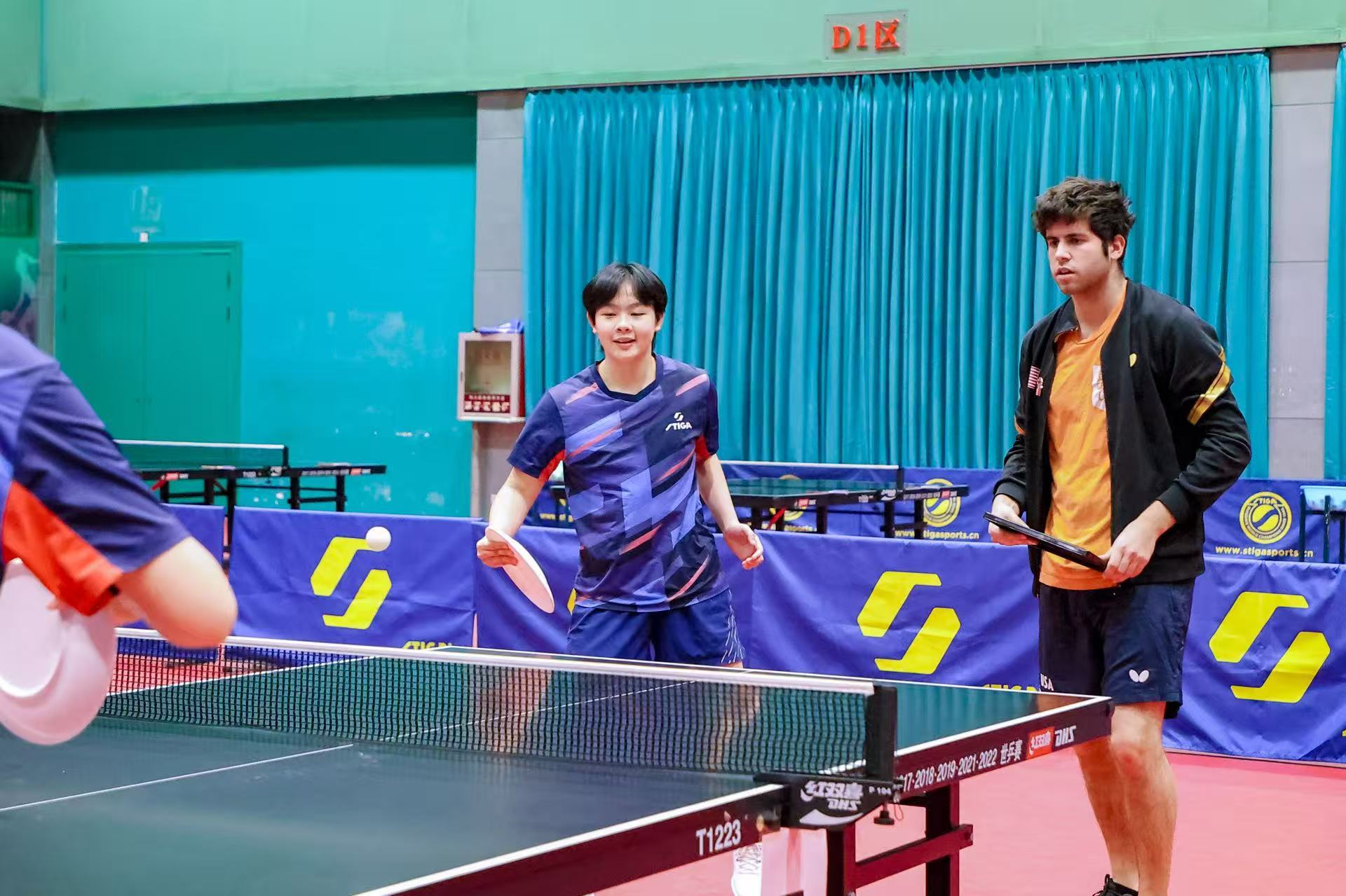 美國乒協(xié)注冊運動員凱?扎雷賓在正定國家乒乓球訓(xùn)練基地與中國青少年球員開展友誼賽