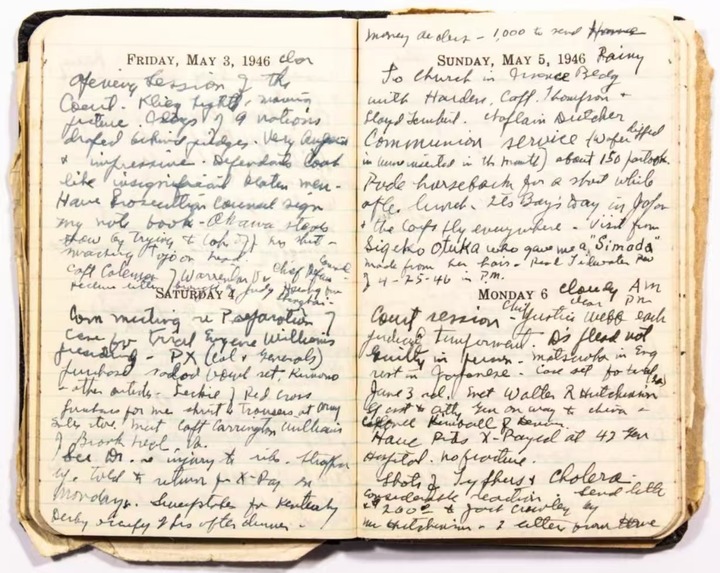 “星期六3月9日——我接到正式命令,前往上海、南京、北平及中國戰(zhàn)區(qū)其他地點,開展戰(zhàn)犯調(diào)查與證據(jù)收集工作?!薄靶瞧诙?月2日——上午11時20分抵達南京?!薄靶瞧谖?月3日——東京審判首次開庭。被告席上的人顯得一派落魄,像是一群微不足道的敗者?!薄?本由薩頓親筆書寫的日記,記錄了1946年至1948年他執(zhí)行東京審判任務期間的諸多細節(jié),是南京大屠殺檔案的重大發(fā)現(xiàn)。