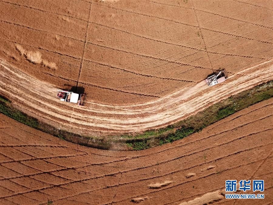 6月2日,在合肥市蜀山區(qū)小廟鎮(zhèn)馬崗村,農(nóng)機手操作機械設備收割小麥(無人機照片)。 “三夏”時節(jié),安徽各地麥收進入高峰期,農(nóng)民搶收小麥,確保顆粒歸倉。新華社記者劉軍喜攝