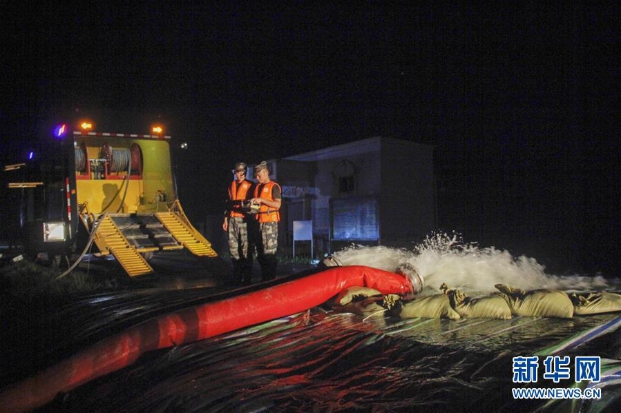 7月13日,在湖北省石首市沙灘子故道,武警第二機(jī)動總隊某支隊官兵利用大型龍吸水裝備連夜進(jìn)行排澇作業(yè)。新華社發(fā)(岳小東攝)