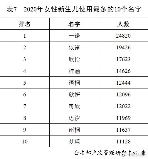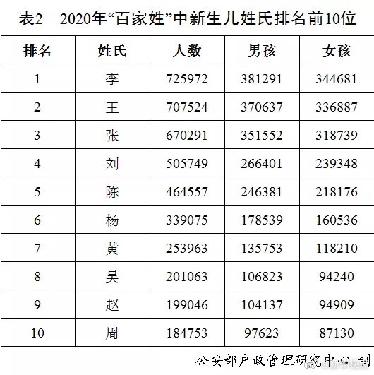 剛剛,公安部戶政管理研究中心二〇二〇年全國姓名報告發(fā)布。按戶籍人口數(shù)量排名,2020年的“百家姓”與2019年相比變化不大?!巴酢薄袄睢薄皬垺薄皠ⅰ薄瓣悺币琅f名列前五,五大姓氏人口總數(shù)占全國戶籍總?cè)丝诘?0.8%。截止到2020年12月31日,2020年出生并已經(jīng)到公安機(jī)關(guān)進(jìn)行戶籍登記的新生兒共1003.5萬,其中男孩529.0萬,占52.7%,女孩474.5萬,占47.3%。2020年“百家姓”中新生兒登記姓氏最多的是“李”,共72.6萬人。2020年出生并已經(jīng)進(jìn)行戶籍登記的女性新生兒中,使用頻率最高的10個名字依次為:“一諾”“依諾”“欣怡”“梓涵”“語桐”“欣妍”“可欣”“語汐”“雨桐”“夢瑤”。與2019年相比,“一諾”“依諾”“欣怡”依舊位列三甲,“語桐”“可欣”“語汐”“夢瑤”進(jìn)入前十。(記者 熊豐、任沁沁)