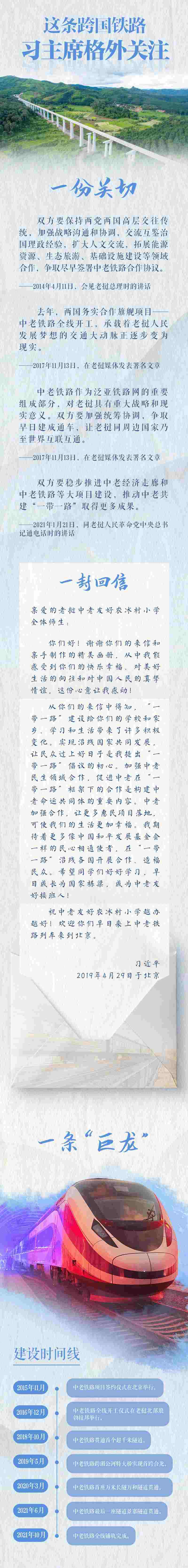 中老鐵路北起中國(guó)昆明,南至老撾萬(wàn)象,全長(zhǎng)1000多公里。這條承載著友誼、科技、綠色、開(kāi)放的跨國(guó)鐵路,是我國(guó)“一帶一路”倡議與老撾“變陸鎖國(guó)為陸聯(lián)國(guó)”戰(zhàn)略對(duì)接的重要項(xiàng)目,也是“一帶一路”倡議提出以后,首條以中方為主投資建設(shè)、全線(xiàn)采用中國(guó)技術(shù)標(biāo)準(zhǔn)、使用中國(guó)設(shè)備并與中國(guó)鐵路網(wǎng)直接聯(lián)通的跨國(guó)鐵路。對(duì)于這條鐵路,習(xí)近平主席一直格外關(guān)注。他與老撾高層多次就中老鐵路建設(shè)進(jìn)行深入溝通,并給老撾萬(wàn)象中老友好農(nóng)冰村小學(xué)師生回信,歡迎他們?cè)缛粘松现欣翔F路列車(chē)來(lái)到北京。