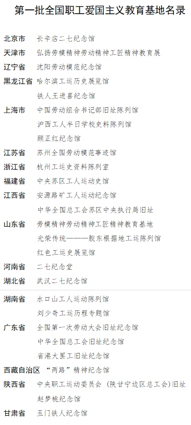 第一批全國職工愛國主義教育基地包括北京市長(zhǎng)辛店二七紀(jì)念館、黑龍江省鐵人王進(jìn)喜紀(jì)念館、上海市中國勞動(dòng)組合書記部舊址陳列館、廣東省全國第一次勞動(dòng)大會(huì)舊址紀(jì)念館、陜西省中央職工運(yùn)動(dòng)委員會(huì)(陜甘寧邊區(qū)總工會(huì))舊址等27家單位。旨在進(jìn)一步加強(qiáng)紅色工運(yùn)資源的保護(hù)挖掘和宣傳利用,引領(lǐng)各級(jí)工會(huì)努力把紅色工運(yùn)資源建設(shè)成為開展黨史學(xué)習(xí)教育的重要陣地,打造成愛國主義教育、革命傳統(tǒng)教育、加強(qiáng)職工思想政治引領(lǐng)的生動(dòng)課堂,團(tuán)結(jié)引導(dǎo)廣大職工群眾更好傳承紅色基因、賡續(xù)紅色血脈、汲取奮進(jìn)力量。第一批全國職工愛國主義教育基地在中國工運(yùn)史上影響重大,代表性強(qiáng)、知名度高,現(xiàn)有的設(shè)施建設(shè)和保護(hù)利用較好,符合時(shí)代要求,具有較強(qiáng)的示范引領(lǐng)作用。