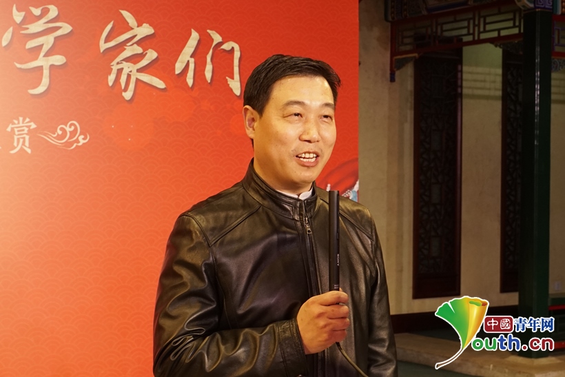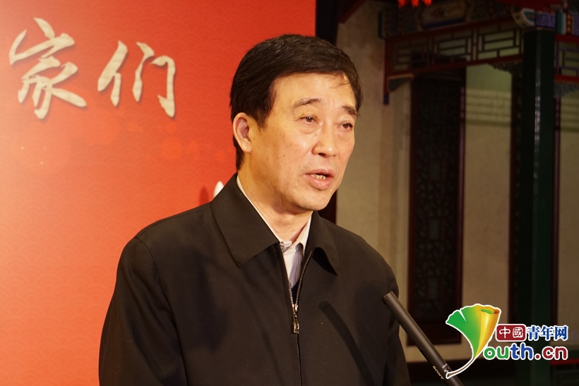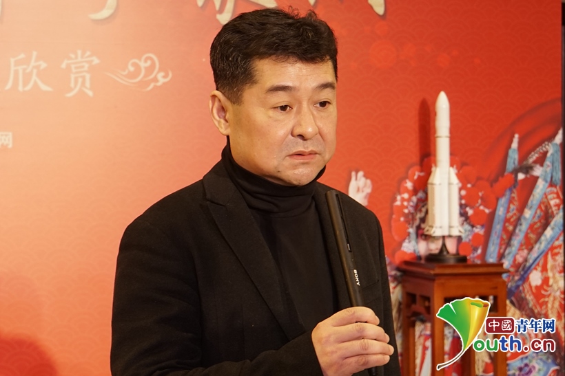 圖為國家京劇院黨委書記、副院長張亞峰向科技工作者送上新春祝福。中國青年網記者 楊晴 攝