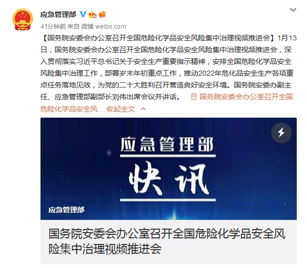 據(jù)應急管理部官方微博消息,近日國務院安委會辦公室召開全國危險化學品安全風險集中治理視頻推進會,會議明確指出要保持高度警覺,加強監(jiān)督檢查和明查暗訪,落實各項安全防范措施,嚴格領導帶班和值班值守,切實抓好歲末年初?;钒踩a(chǎn)工作,堅決防范各類事故發(fā)生。