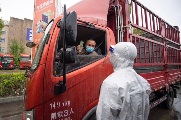 4月13日,工作人員查驗駛入杭州傳化公路港的貨車司機健康碼。新華社記者江漢攝