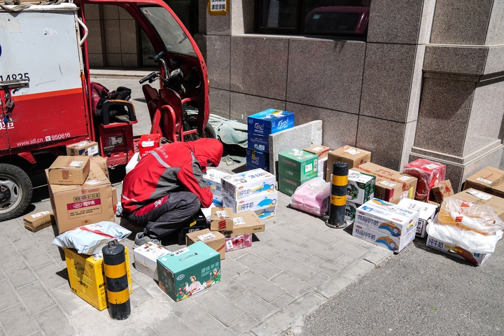 2022年4月26日,在北京市一小區(qū)門口,快遞員在整理貨品準備投遞。新華社記者彭子洋攝