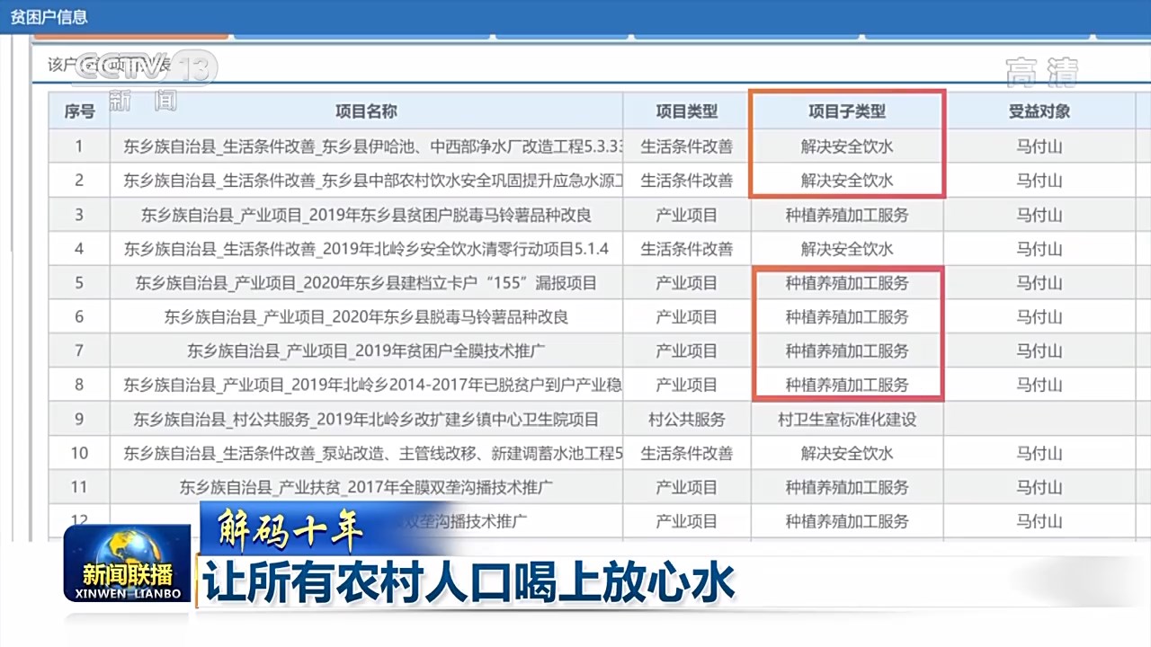 水能解渴,更能致富。在全國(guó)扶貧開發(fā)信息系統(tǒng)中,我們找到了過去十年中“因水致貧”的家庭。當(dāng)我們查詢這些貧困戶的脫貧措施和鞏固提升措施,可以看到“解決安全飲水”和“特色種植、養(yǎng)殖產(chǎn)業(yè)”總會(huì)同時(shí)出現(xiàn)。