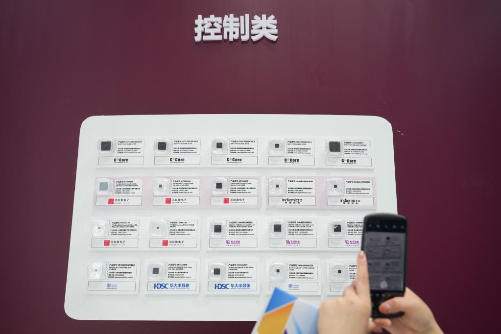 8月26日,一位參觀者在拍攝展出的車用芯片。當日,2022世界新能源汽車大會在北京、海南兩地以線上、線下相結(jié)合的方式召開。新華社記者鞠煥宗攝
