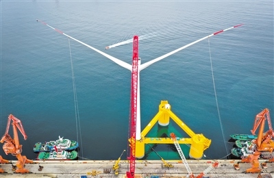 由中國(guó)船舶集團(tuán)海裝風(fēng)電股份有限公司牽頭,聯(lián)合相關(guān)單位自主研制的“扶搖號(hào)”浮式風(fēng)電機(jī)組浮體平臺(tái)上配備6.2兆瓦抗臺(tái)型I類風(fēng)力發(fā)電機(jī)組,在深遠(yuǎn)海應(yīng)用場(chǎng)將依靠九個(gè)對(duì)稱分布的懸錨鏈系泊實(shí)現(xiàn)固定。圖為完成總裝的國(guó)內(nèi)首臺(tái)深遠(yuǎn)海浮式風(fēng)電裝備“扶搖號(hào)”在茂名廣港碼頭靜待拖航(無(wú)人機(jī)照片)。記者劉大偉攝
