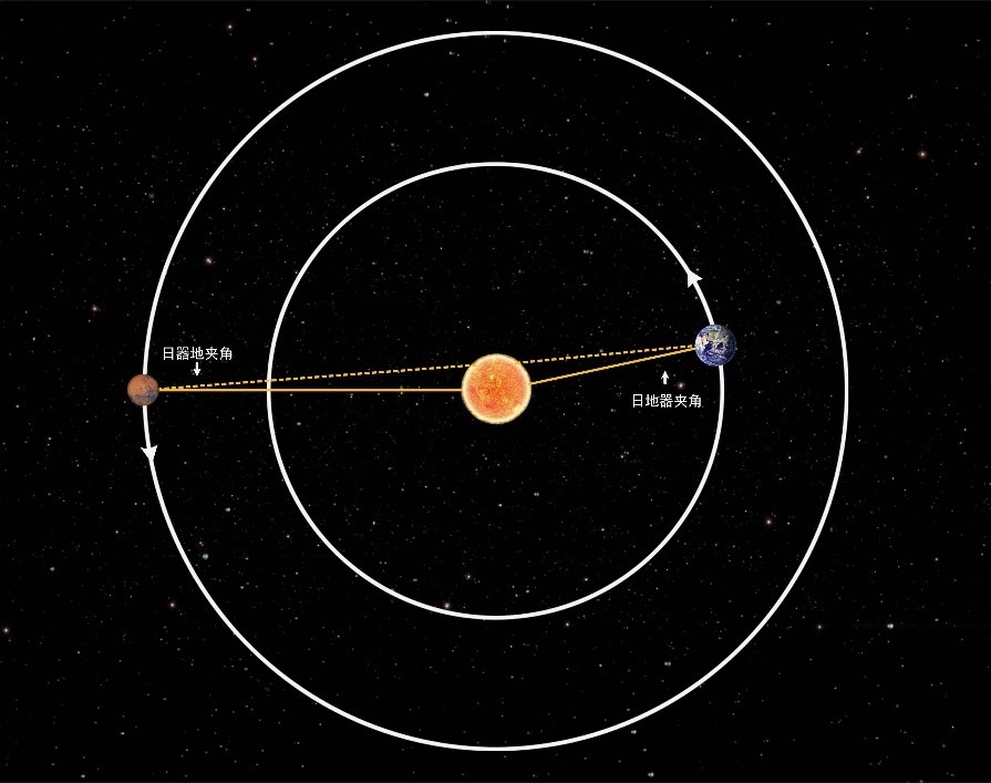 火星日凌期間,地球、火星與太陽(yáng)之間的位置關(guān)系示意圖。(受訪對(duì)象供圖)