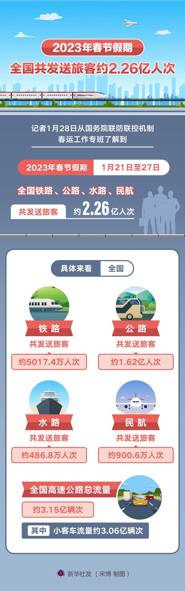 2023年春節(jié)假期全國共發(fā)送旅客約2.26億人次