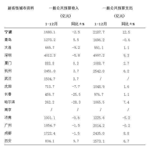 一般公共預算收入方面,除資料缺失的南京外,14座城市中有9座城市出現(xiàn)負增長,其中哈爾濱去年一般公共預算收入262.2億元,增速為-28.3%,一般公共預算支出1065.5億元,增速為7.4%。