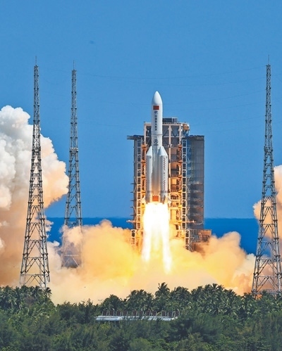 搭載問天實(shí)驗(yàn)艙的長征五號(hào)B遙三運(yùn)載火箭,在海南文昌航天發(fā)射場點(diǎn)火發(fā)射。 新華社記者 李 剛攝
