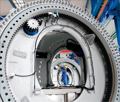 ▲ 在黑龍江省齊齊哈爾市中國(guó)一重集團(tuán)有限公司風(fēng)電裝備生產(chǎn)制造廠生產(chǎn)車(chē)間,工人進(jìn)行生產(chǎn)作業(yè)(2021年7月1日攝) 王建威攝
