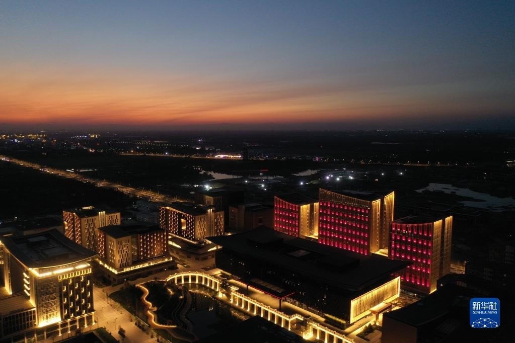 這是雄安新區(qū)商務(wù)服務(wù)中心夜景(2022年9月7日攝,無(wú)人機(jī)照片)。新華社記者 朱旭東 攝