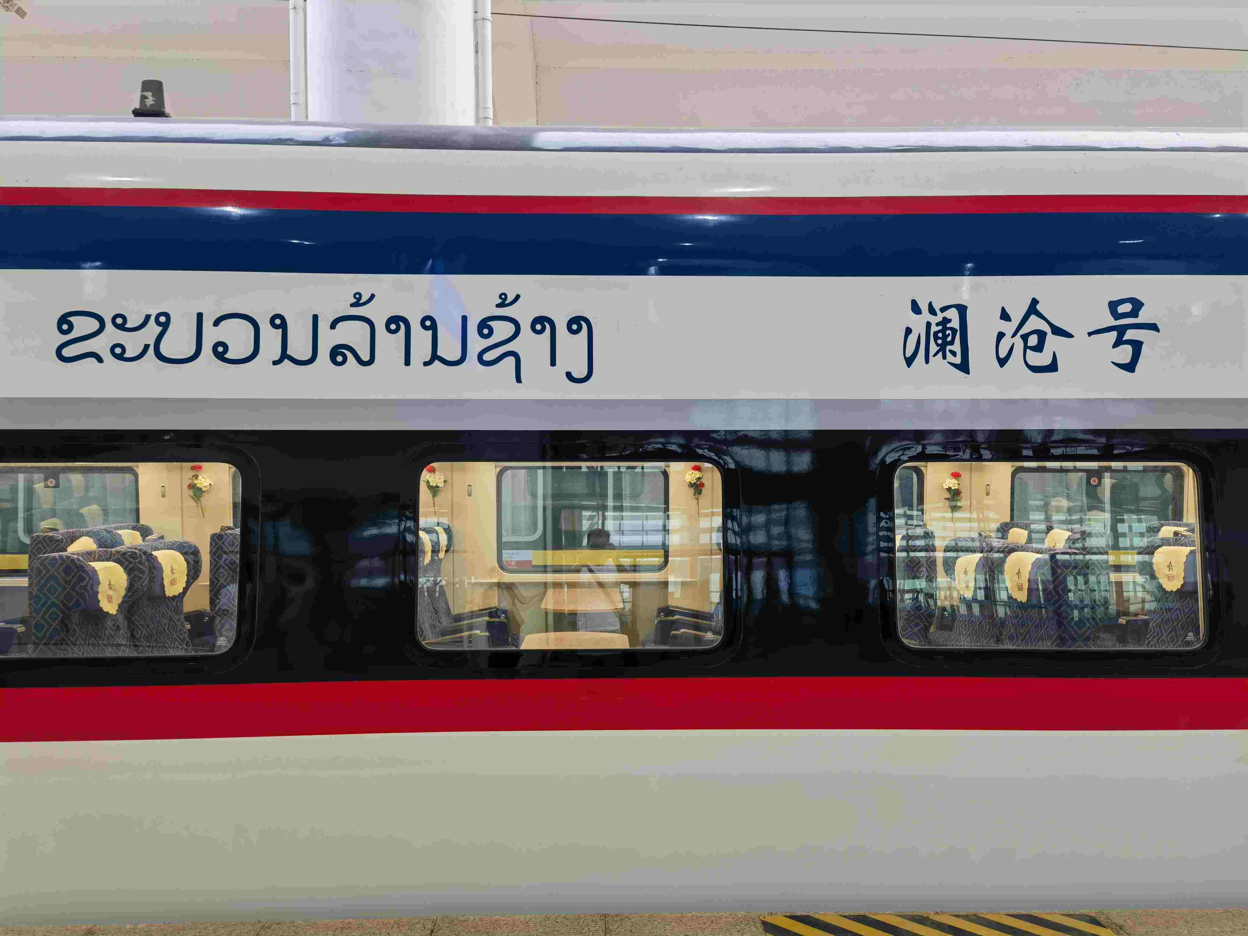 擔當跨境客運服務的中老鐵路動車組,從昆明南始發(fā)的為采用綠色涂裝的復興號CR200J型動力集中動車組“綠巨人”,從萬象站始發(fā)的為采用紅白藍三色涂裝的“瀾滄號”。列車基于中國“復興號”動車組技術平臺,結合中老兩國自然環(huán)境、線路條件、本土文化以及跨國運營需求為中老鐵路“量身打造”,設計時速160公里,定員載客720人。( 張進剛 姜超 )