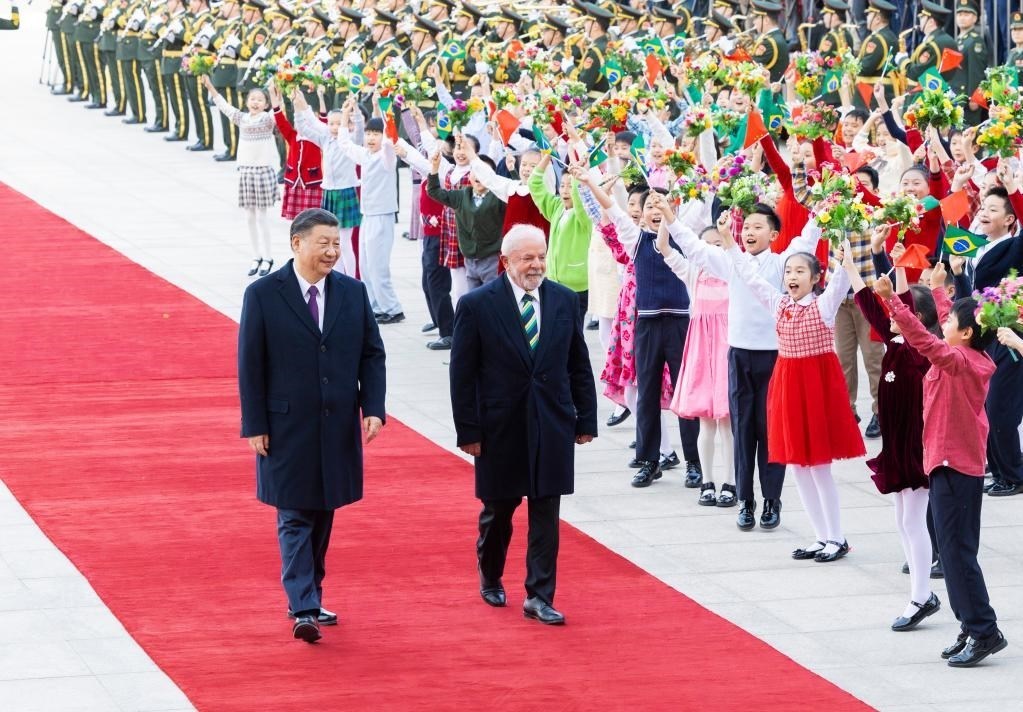 4月14日下午,國家主席習近平在北京人民大會堂同來華進行國事訪問的巴西總統(tǒng)盧拉舉行會談。這是會談前,習近平在人民大會堂東門外廣場為盧拉舉行歡迎儀式。新華社記者 劉衛(wèi)兵 攝