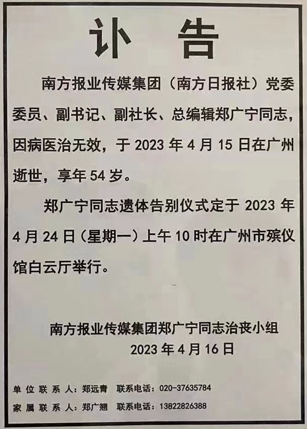 據(jù)南方報(bào)業(yè)傳媒集團(tuán)發(fā)布的訃告,南方報(bào)業(yè)傳媒集團(tuán)(南方日?qǐng)?bào)社)黨委委員、副書記、副社長(zhǎng)、總編輯鄭廣寧同志,因病醫(yī)治無效,于2023年4月15日在廣州逝世,享年54歲。