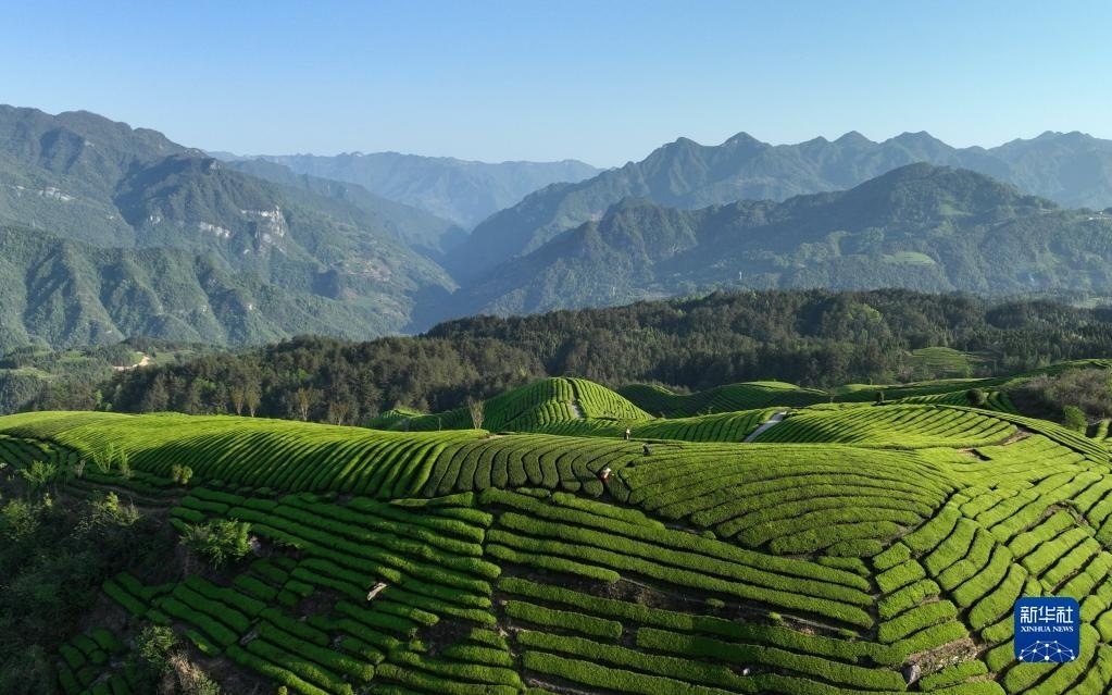 4月16日,茶農(nóng)在鶴峰縣走馬鎮(zhèn)木耳山茶園采茶(無人機照片)。   新華社發(fā)(楊順丕攝)