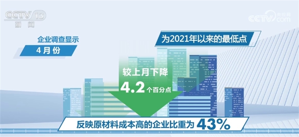 今年以來(lái),原材料成本、物流和勞動(dòng)力成本普遍回落。企業(yè)調(diào)查顯示,4月份反映原材料成本高的企業(yè)比重為43%,較上月下降4.2個(gè)百分點(diǎn),為2021年以來(lái)的最低點(diǎn)。反映物流成本高和勞動(dòng)力成本高的企業(yè)比重分別為27.5%和30%,較上月下降1.9和1.1個(gè)百分點(diǎn)。