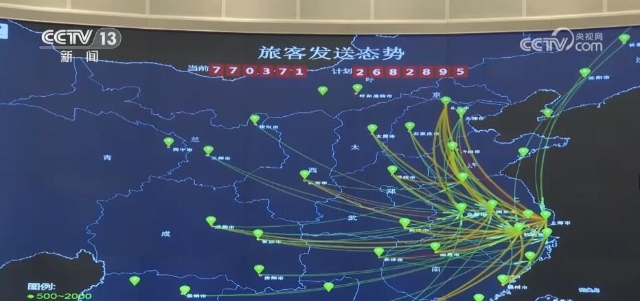 總臺央視記者 鄭連凱:在調(diào)度大廳的屏幕上,我們可以實時看到包括剛剛采訪的虹橋站在內(nèi),整個長三角地區(qū)740多座車站的客流情況,以及13000多公里鐵路線上列車的運行狀態(tài)。而這張圖顯示的是從長三角連通全國各地的干線鐵路的繁忙程度,其中紅色的京滬、滬漢榮、滬昆代表著最繁忙,這里的工作人員可以根據(jù)客票需求隨時調(diào)度,增開臨客列車。