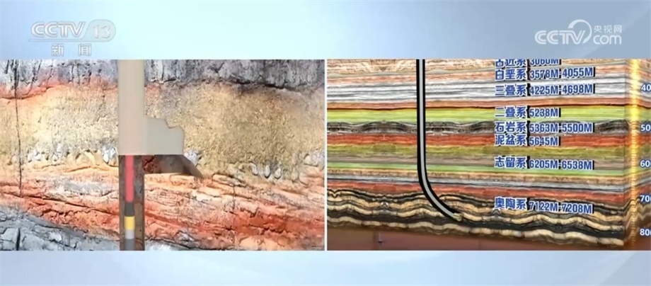 為了讓大家更好地理解鉆井工作,我們借助虛擬技術(shù)制作了一個地層結(jié)構(gòu)圖。開鉆施工后,將從新近系開始,陸續(xù)穿越古近系、白堊系、三疊系等,最后到達奧陶系,總共要經(jīng)過9個地層,最后來到9472米的油層深處。