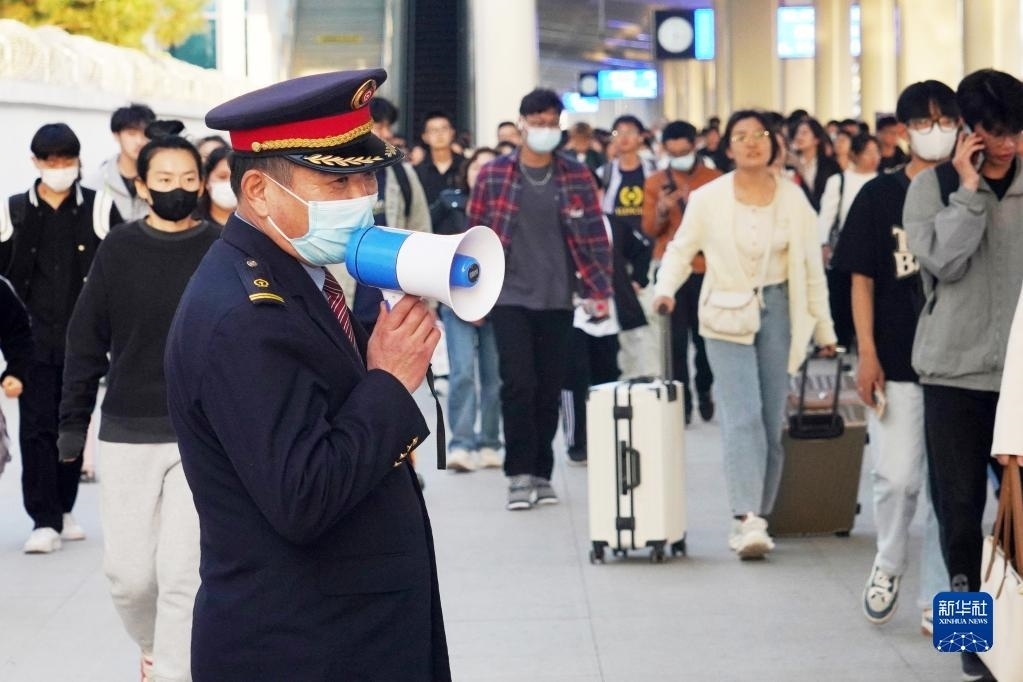 4月29日,淄博火車站工作人員在引導出站旅客。