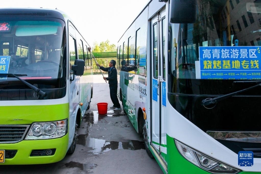 4月29日,在淄博市高青縣客運站,一名司機在保養(yǎng)車輛。當地推出1元“燒烤公交”專線方便游客出行。