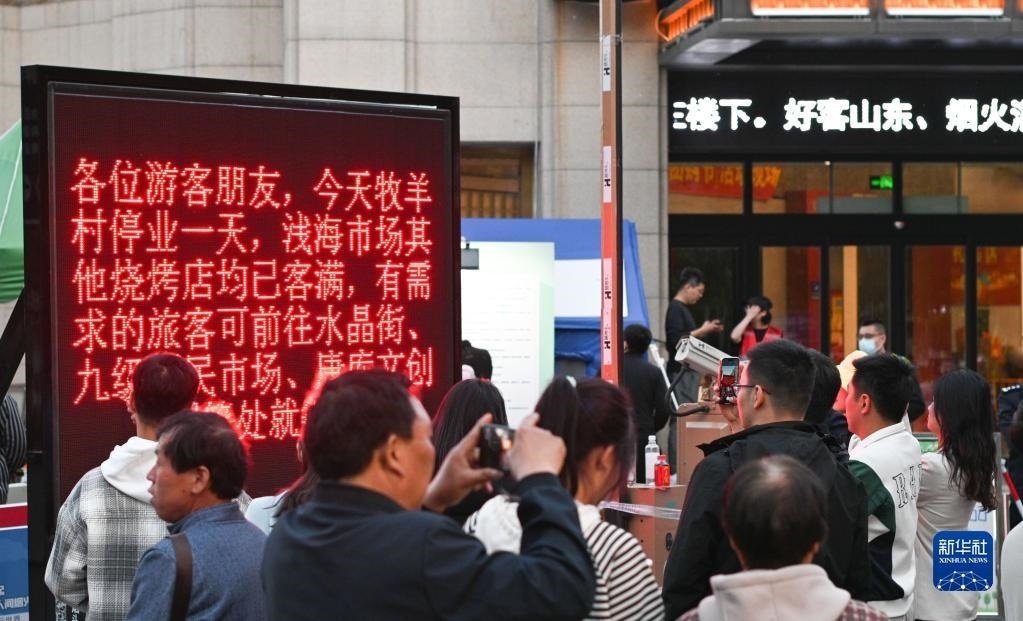 4月29日,在淄博一家燒烤店前,店主通過電子屏公示停業(yè)休息信息,提醒游客合理安排行程。