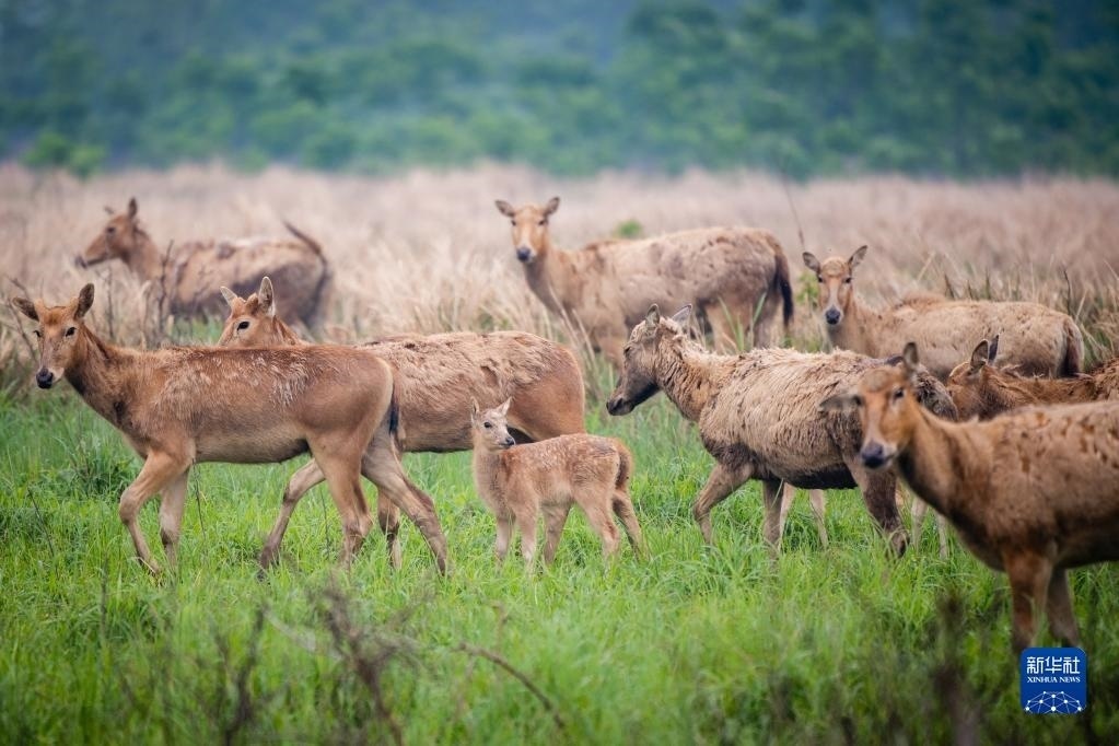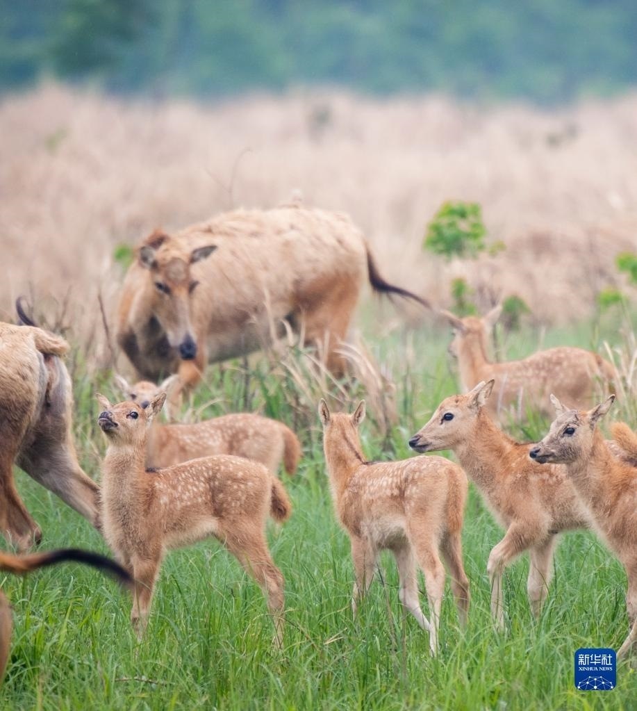 4月28日,一群麋鹿帶著幼鹿在石首麋鹿國家級自然保護區(qū)活動。孕期母鹿通常會選擇較為隱蔽的地方獨自待產(chǎn)。剛出生的幼鹿體格較弱,母鹿一般會獨自喂養(yǎng)約一周后再將其帶回鹿群。
