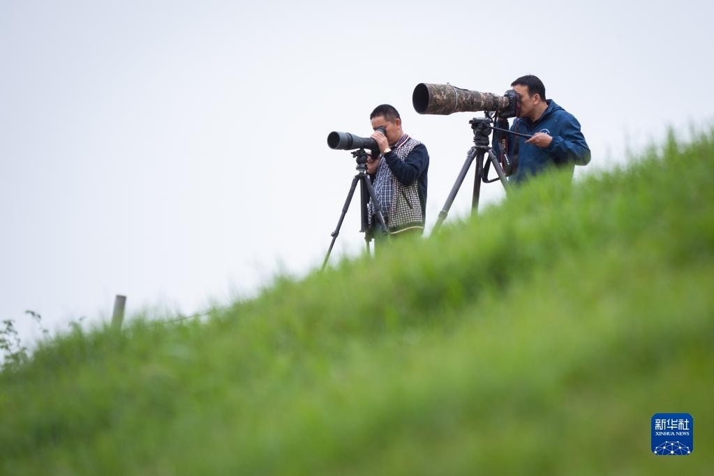 4月29日,在石首麋鹿國家級自然保護區(qū),工程師張玉銘(右)和巡護員劉吉高在觀測遠處的麋鹿群。