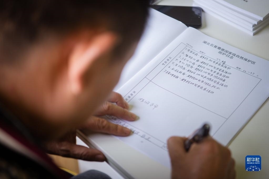 4月29日,在石首麋鹿國家級自然保護區(qū),巡護員劉吉高填寫巡護日志。
