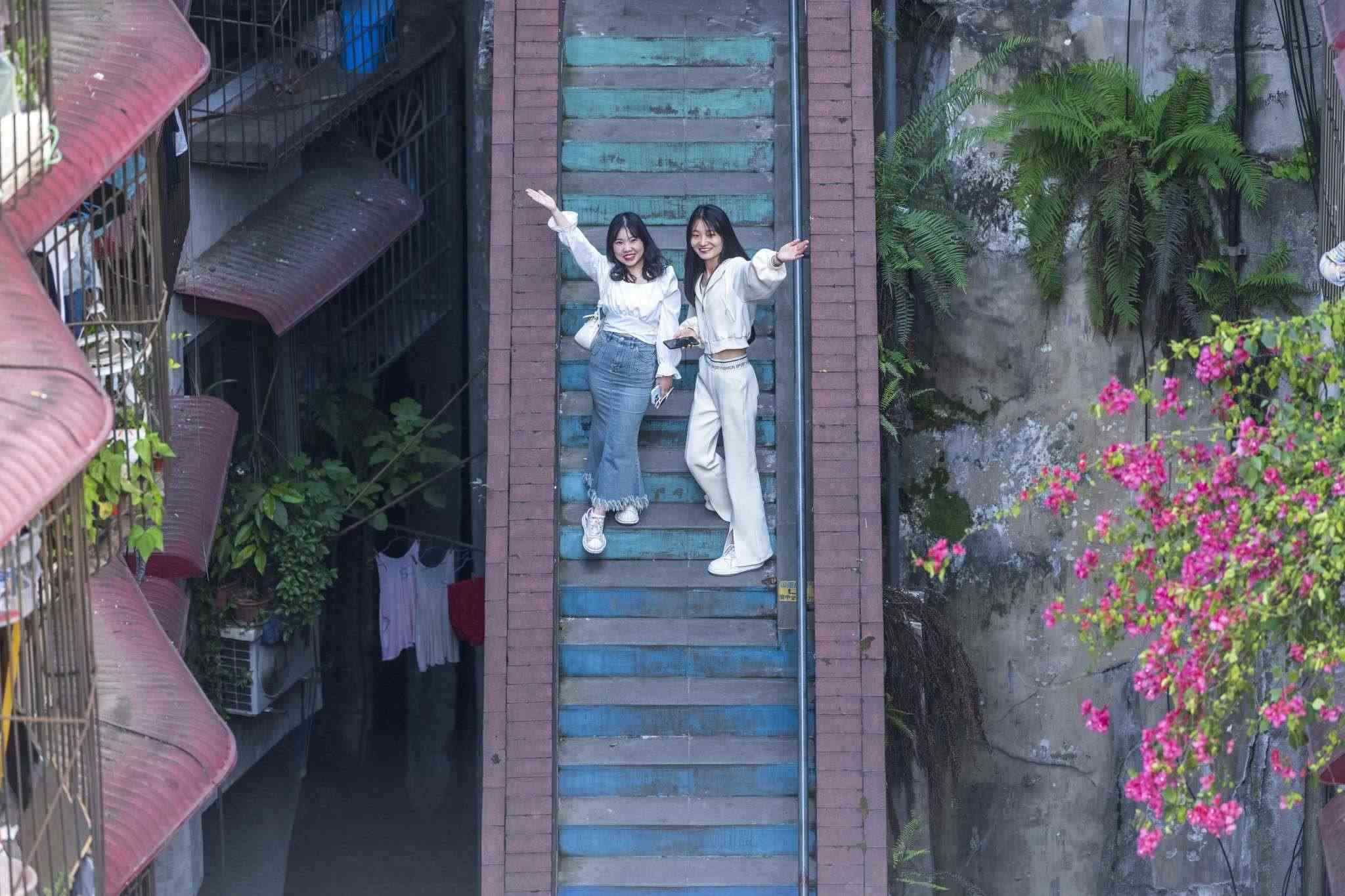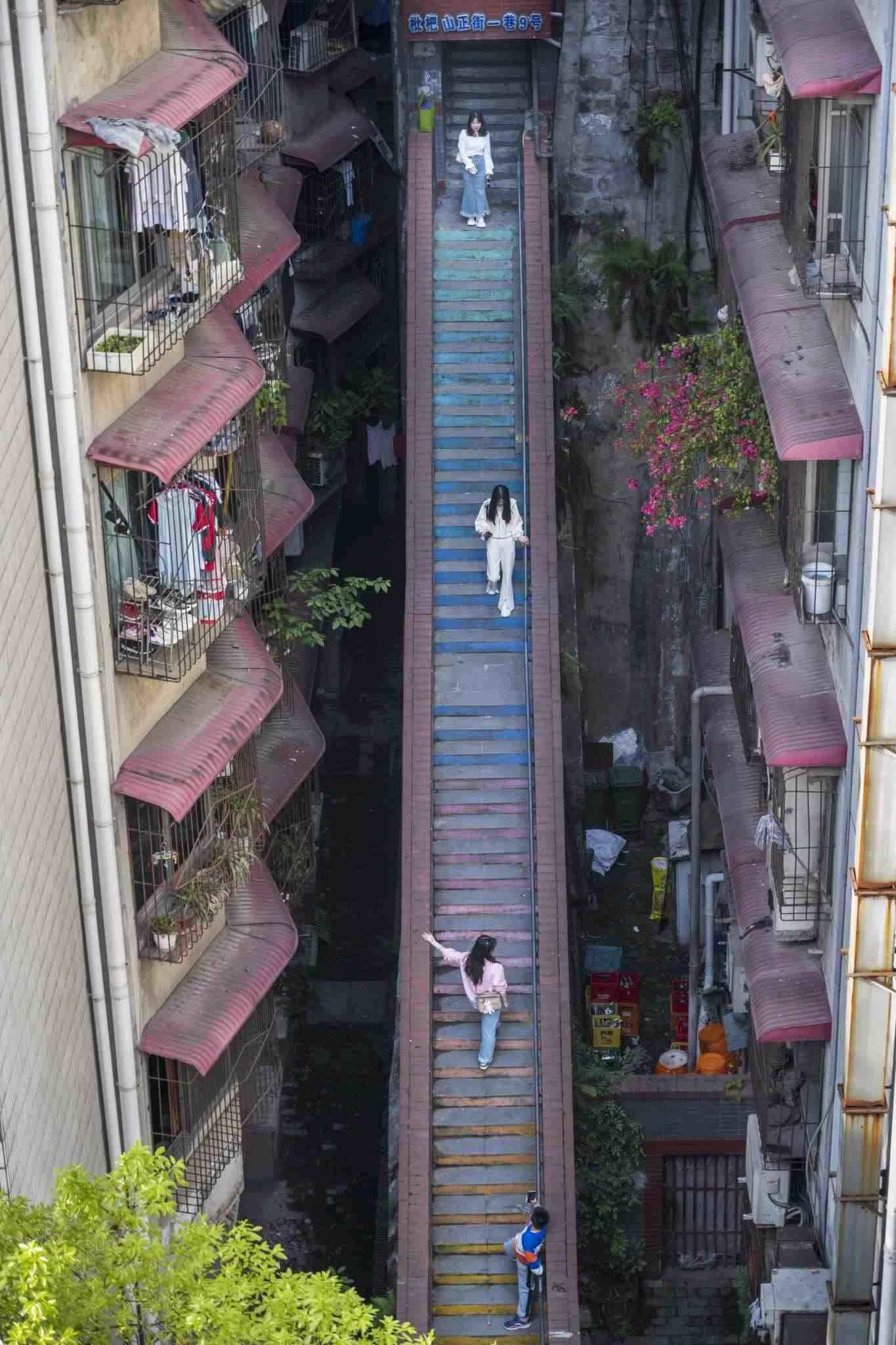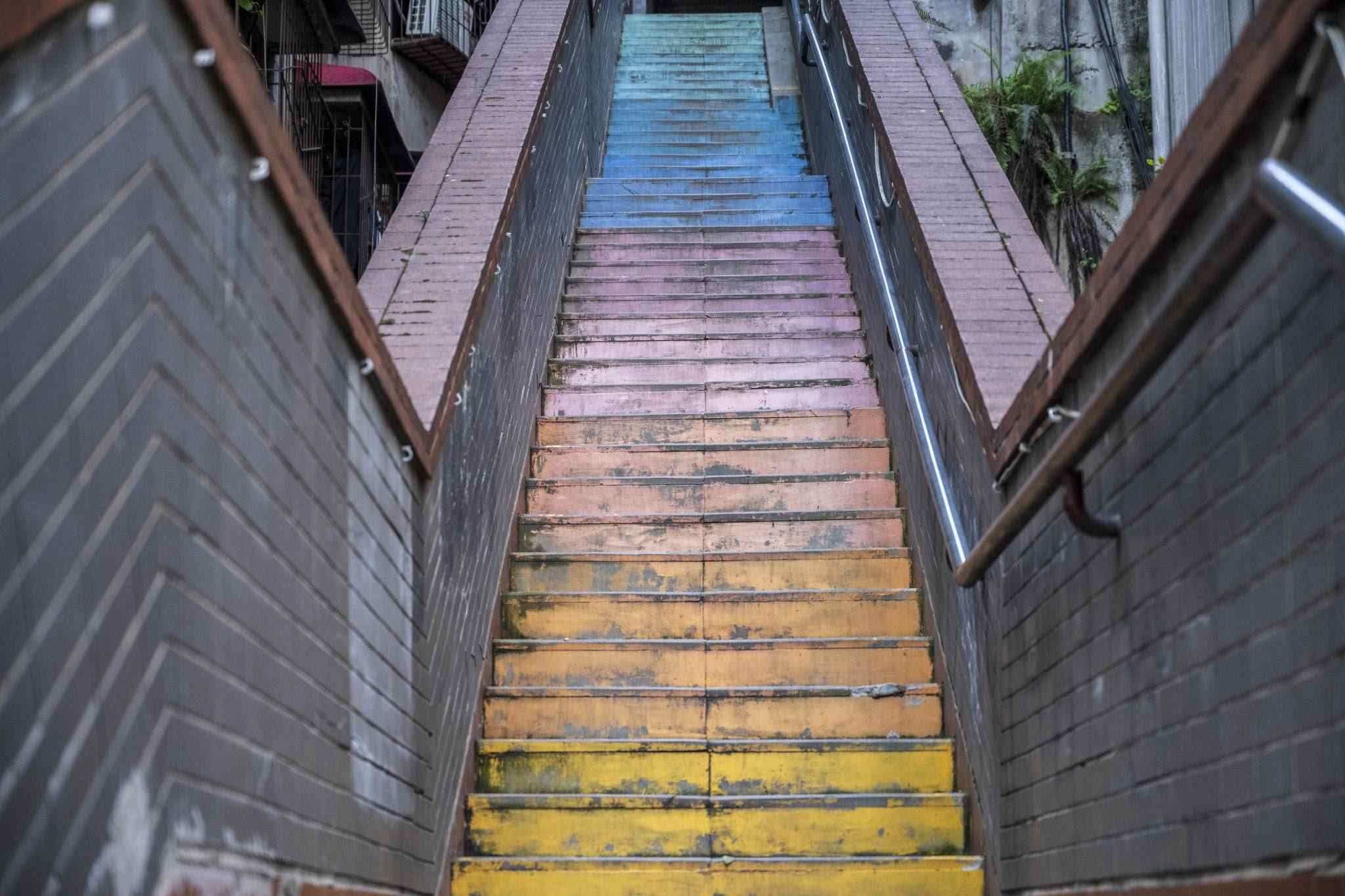 “彩虹樓梯”位于重慶渝中區(qū)枇杷山正街的居民樓間,高約20米,共有50多級階梯,極具山城特色。經過多種顏色涂鴉后,吸引不少市民和攝影愛好者“打卡”。視覺中國