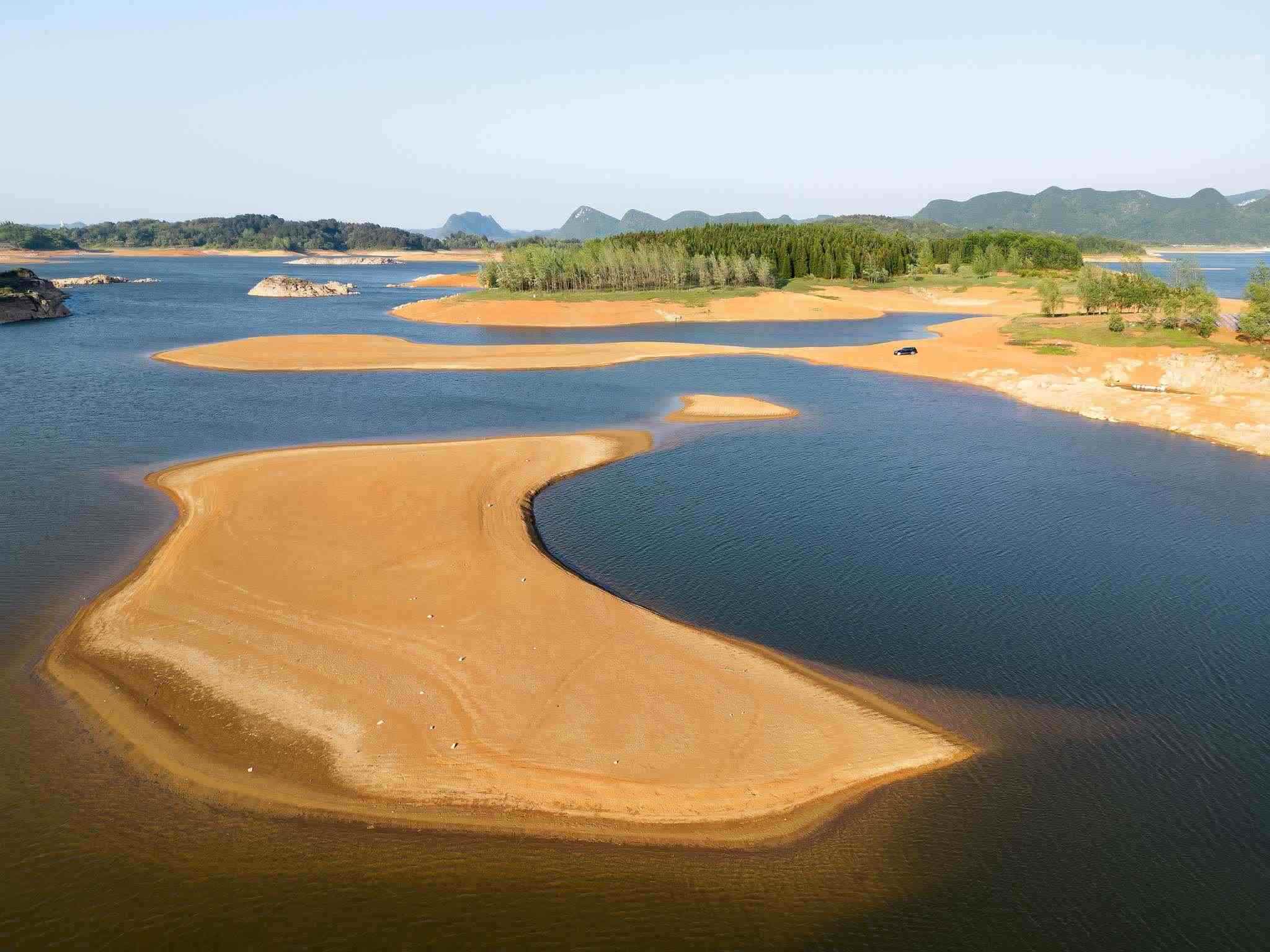 2023年5月2日,貴陽,紅楓湖水位線下降,湖底大面積裸露,猶如水上丹霞。