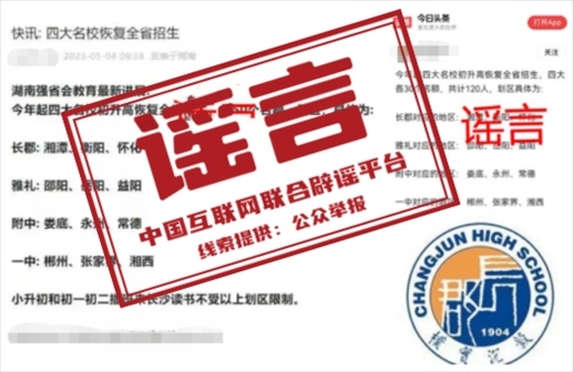 真相:近日,一些網(wǎng)站和自媒體平臺發(fā)布“今年起,長郡中學(xué)、雅禮中學(xué)、湖南師大附中、長沙市一中等長沙‘四大名?!跎呋謴?fù)全省招生”的信息引發(fā)關(guān)注。5月4日,湖南省教育廳對此發(fā)布聲明稱,此消息為不實(shí)消息。湖南省自2021年全面規(guī)范普通高中招生,禁止跨區(qū)域招生,并對違規(guī)招生行為進(jìn)行嚴(yán)肅查處。請大家不信謠不傳謠。(來源:湖南省教育廳微信公眾號)