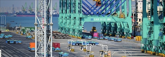 智能水平運輸機器人在天津港全物聯(lián)網(wǎng)集裝箱碼頭作業(yè)(2023 年2月21日攝)李然攝 / 本刊