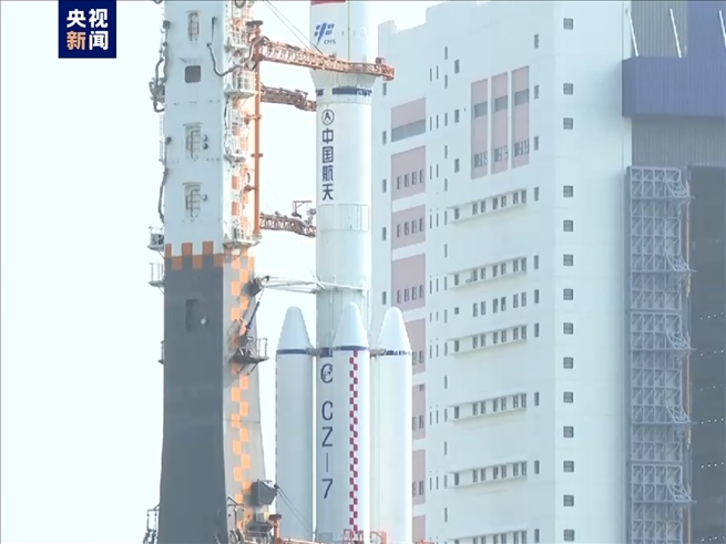 5月7日,在文昌航天發(fā)射場,天舟六號貨運飛船和長征七號遙七運載火箭組合體開始進行垂直轉(zhuǎn)運。