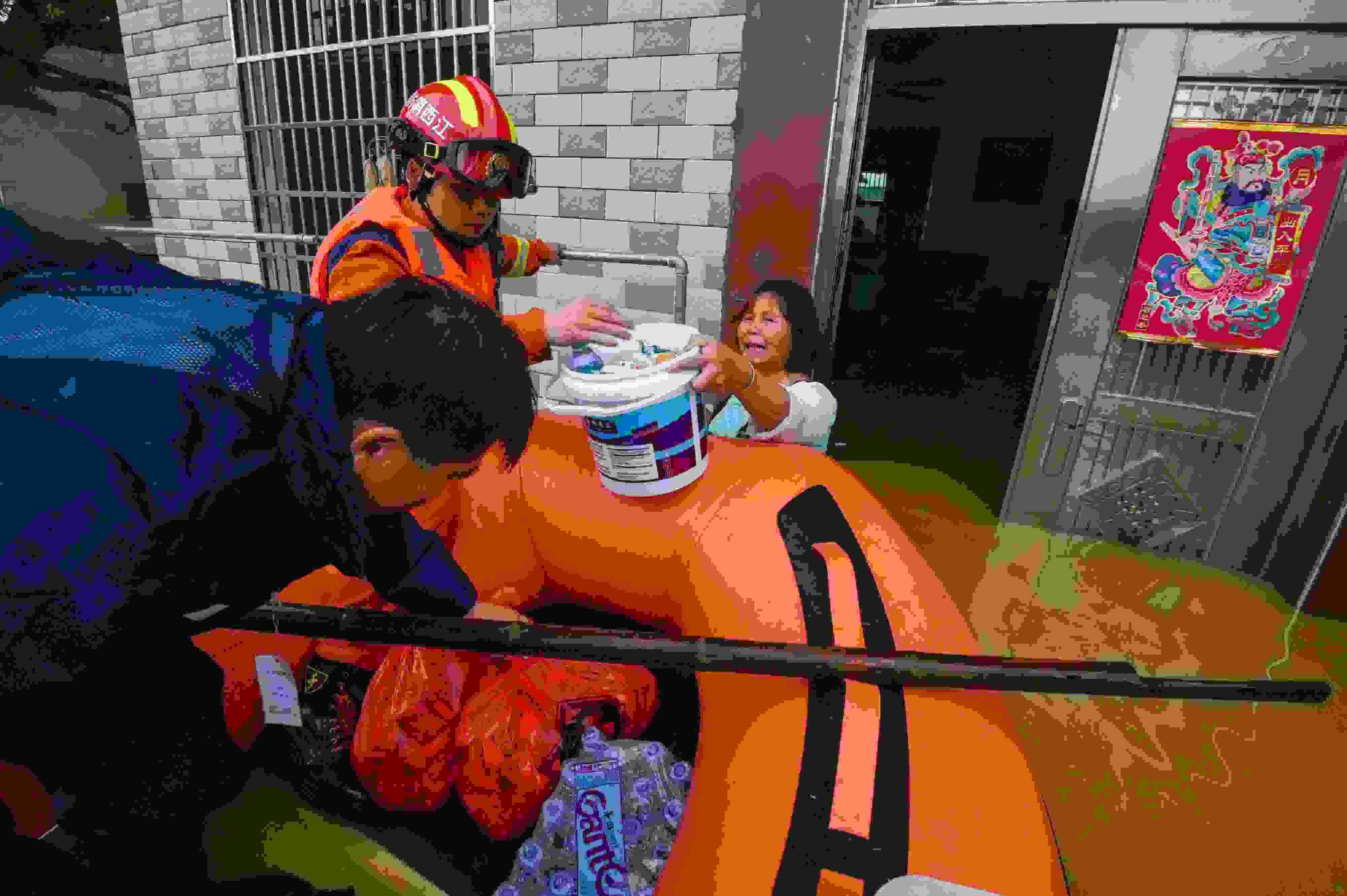2023年5月6日,江西吉安,新干縣消防救援大隊隊員在麥斜鎮(zhèn)拿埠村給受困群眾運送生活物資。 視覺中國