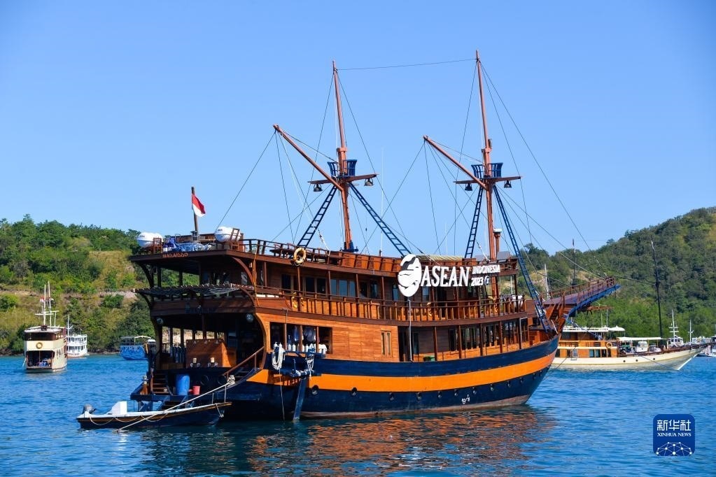 這是5月12日在印度尼西亞拉布安巴焦海邊拍攝的一艘掛著2023年?yáng)|盟峰會(huì)標(biāo)志的游船。