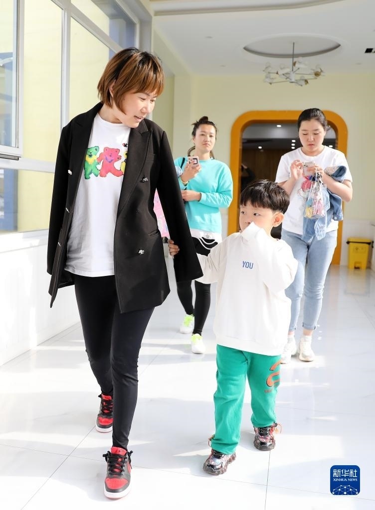 5月11日,兒子拉著韓丹的衣袖,走出幼兒園。   新華社記者 姚劍鋒 攝