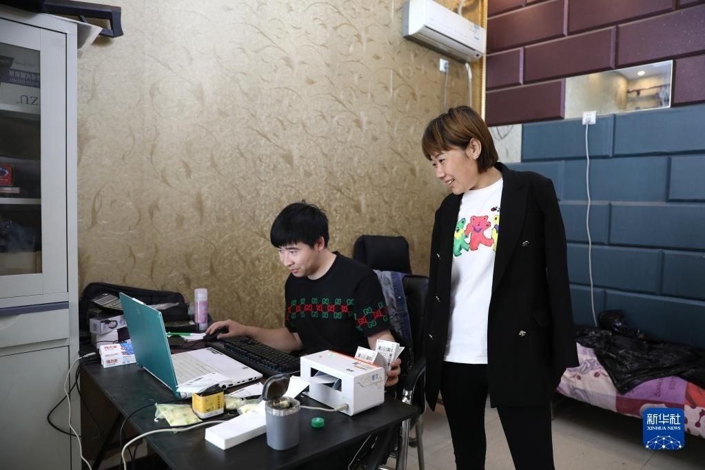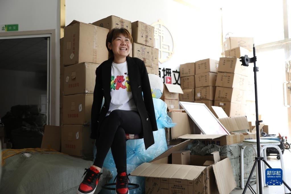5月11日,韓丹在自己開的網(wǎng)絡(luò)傳媒公司內(nèi),詢問當(dāng)天直播售貨情況。   新華社記者 姚劍鋒 攝