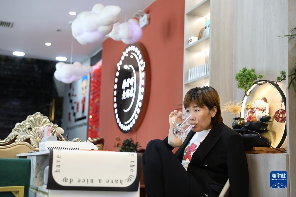 5月11日,韓丹在自己開的火鍋店里休息喝水。   新華社記者 姚劍鋒 攝