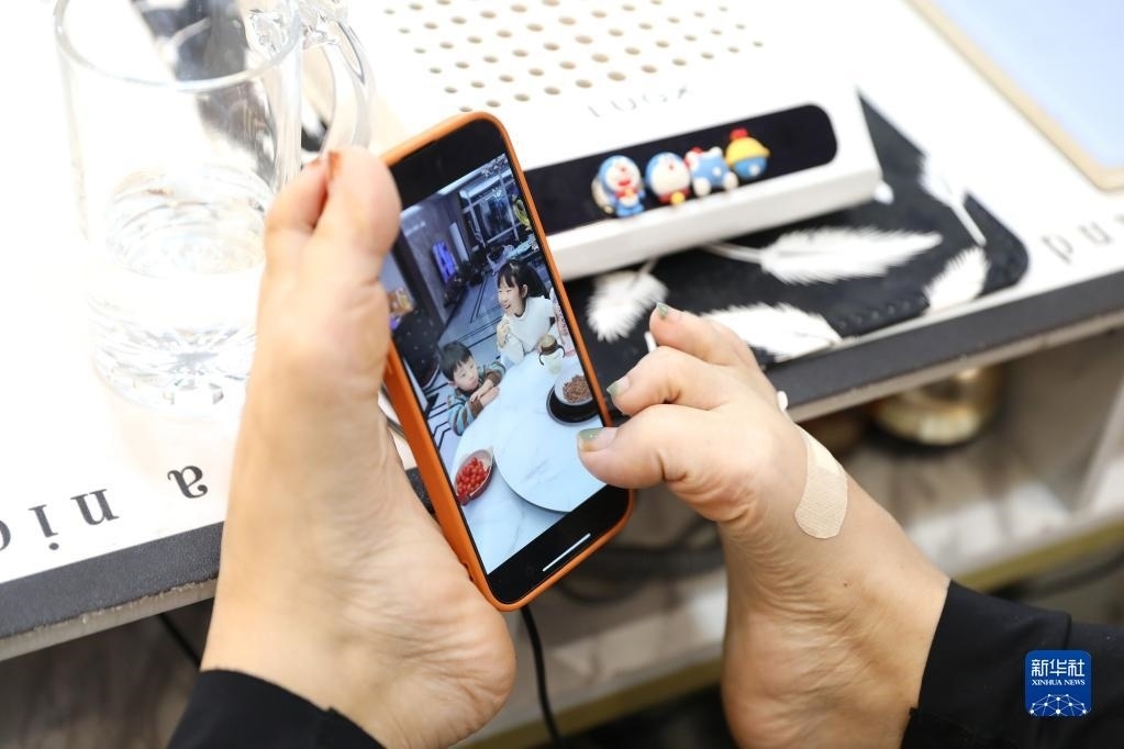 5月11日,韓丹翻看著手機(jī)里兩個(gè)孩子的視頻。   新華社記者 姚劍鋒 攝